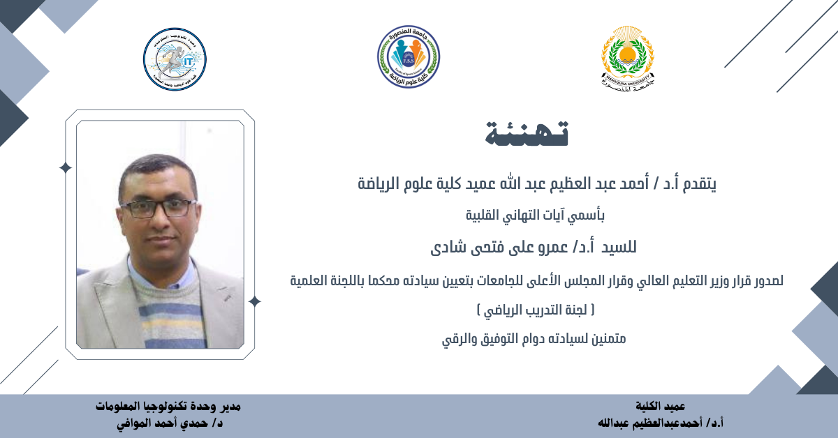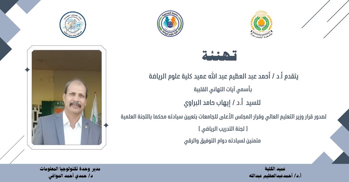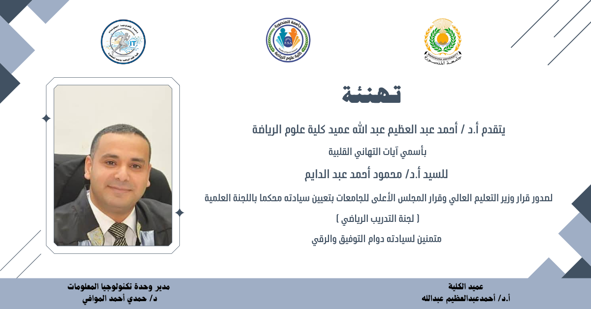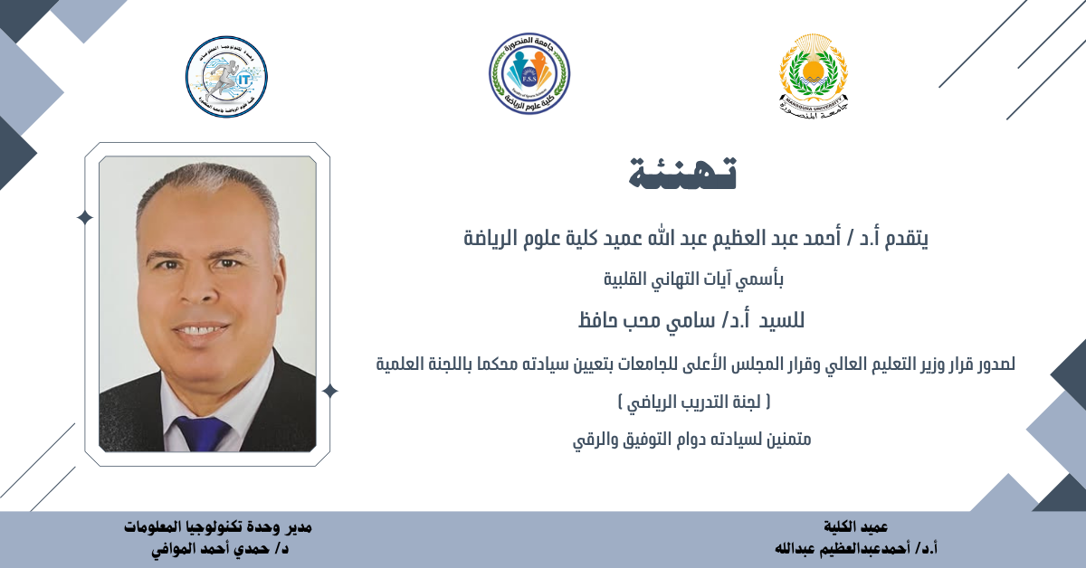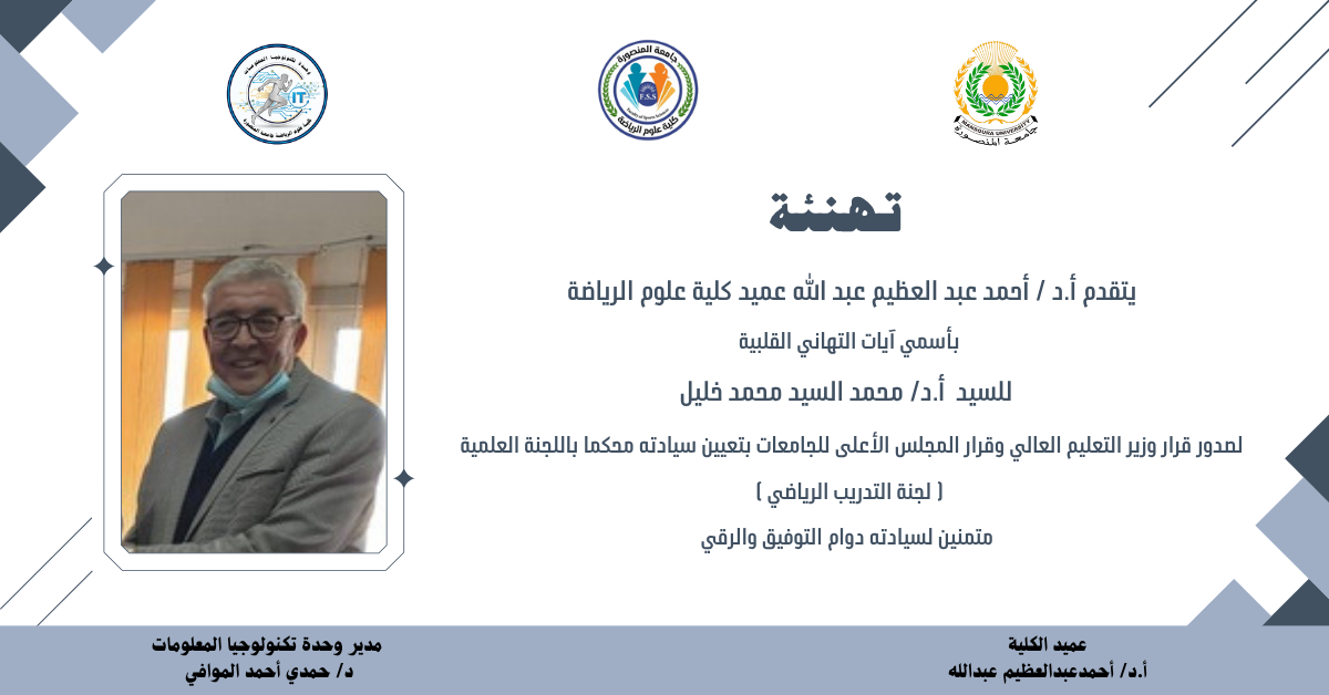بأسمى آيات التهاني القلبية إلى السادة الأساتذة أعضاء هيئة التدريس الذين صدر لهم قرار وزير التعليم العالي وقرار المجلس الأعلى للجامعات بتعيينهم مُحكّمين باللجنة العلمية (لجنة التدريب الرياضي).