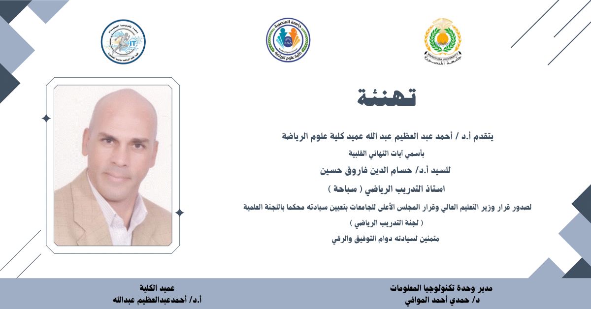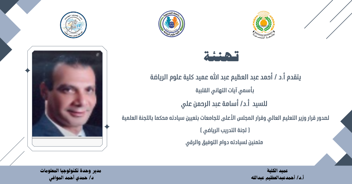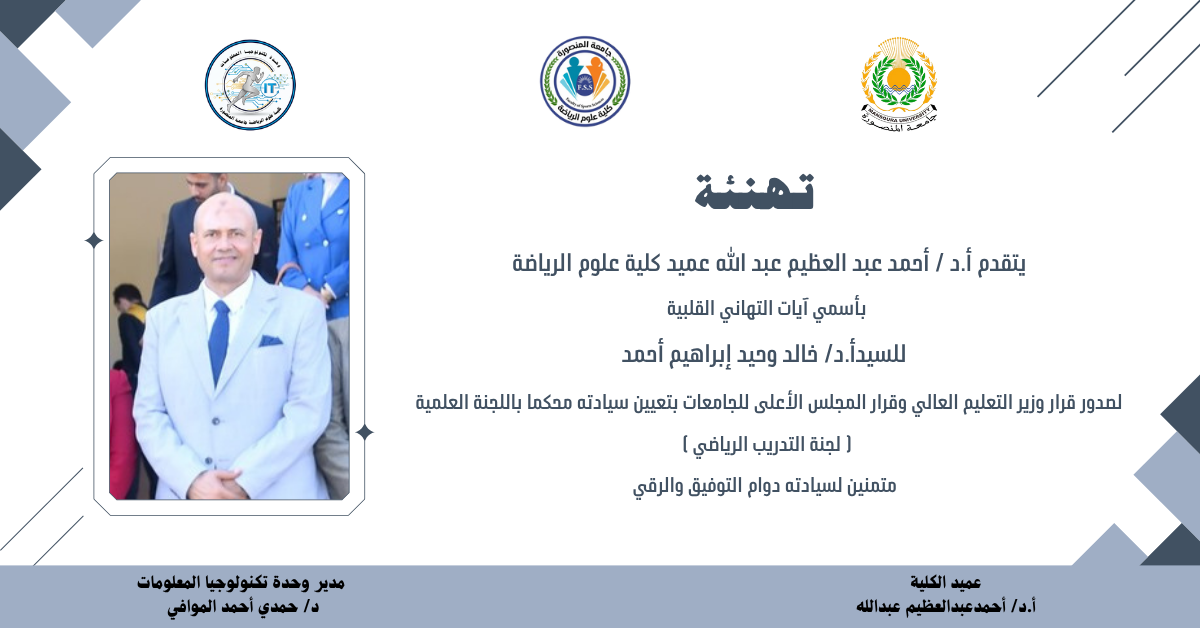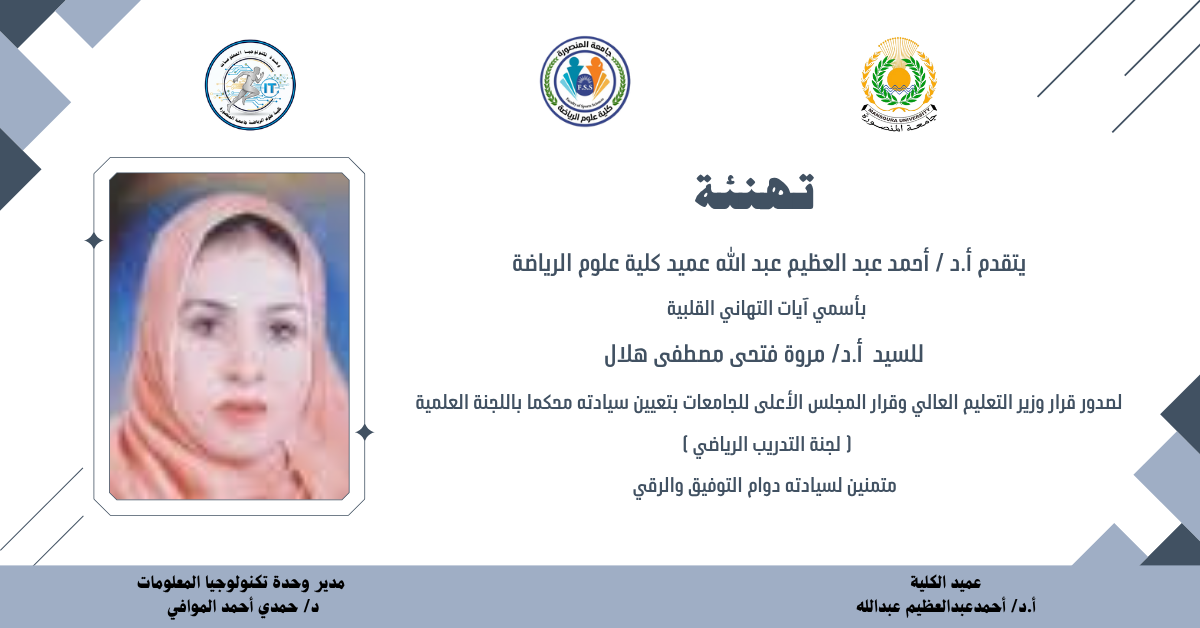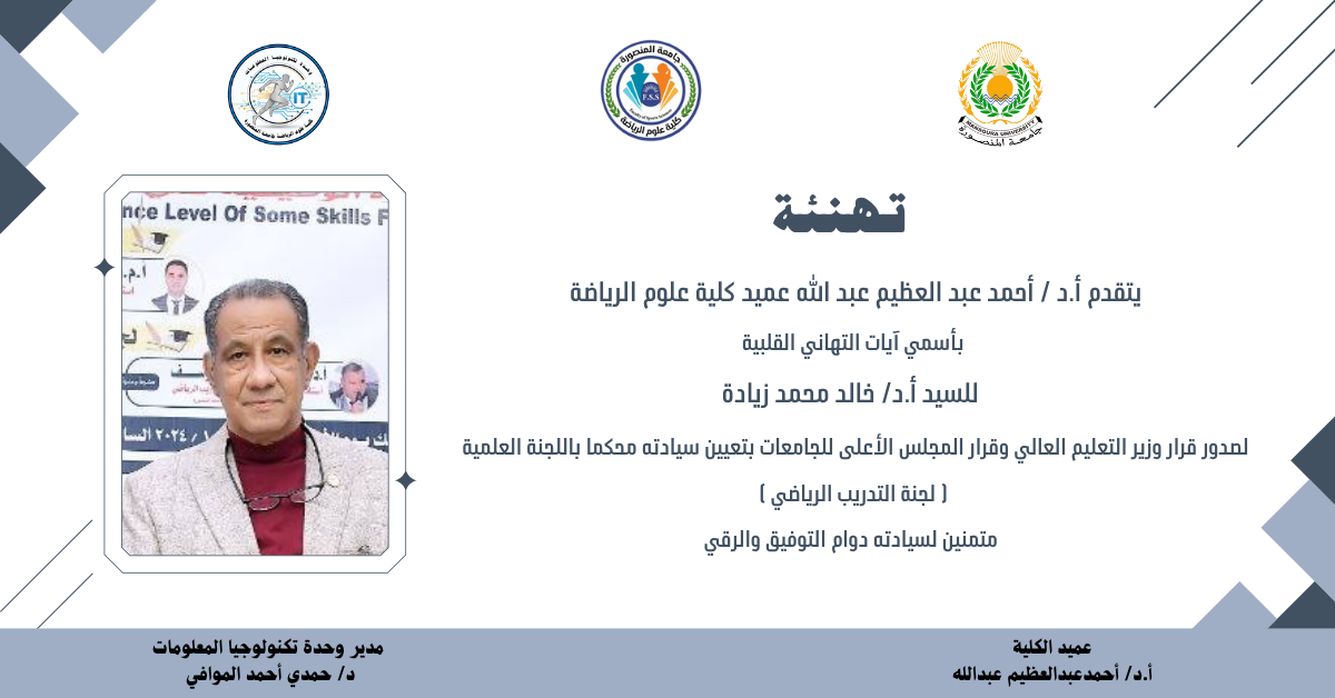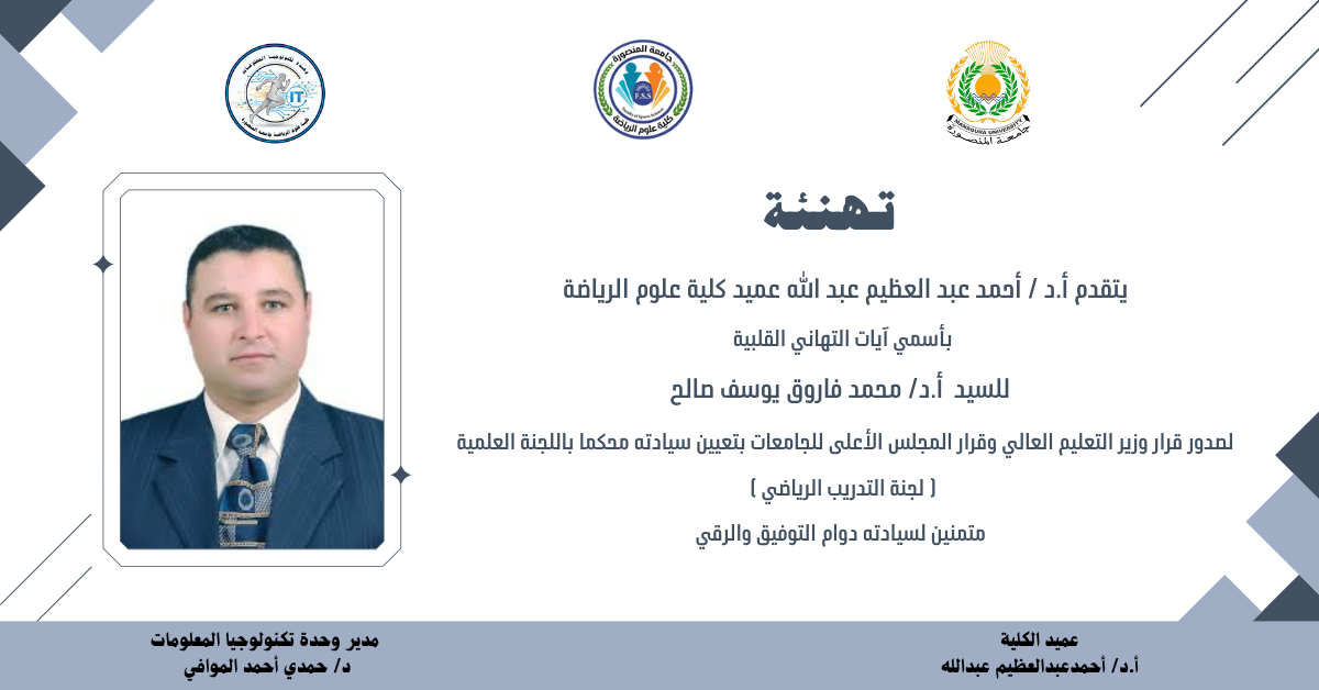 بأسمى آيات التهاني القلبية إلى السادة الأساتذة أعضاء هيئة التدريس الذين صدر لهم قرار وزير التعليم العالي وقرار المجلس الأعلى للجامعات بتعيينهم مُحكّمين باللجنة العلمية (لجنة التدريب الرياضي).